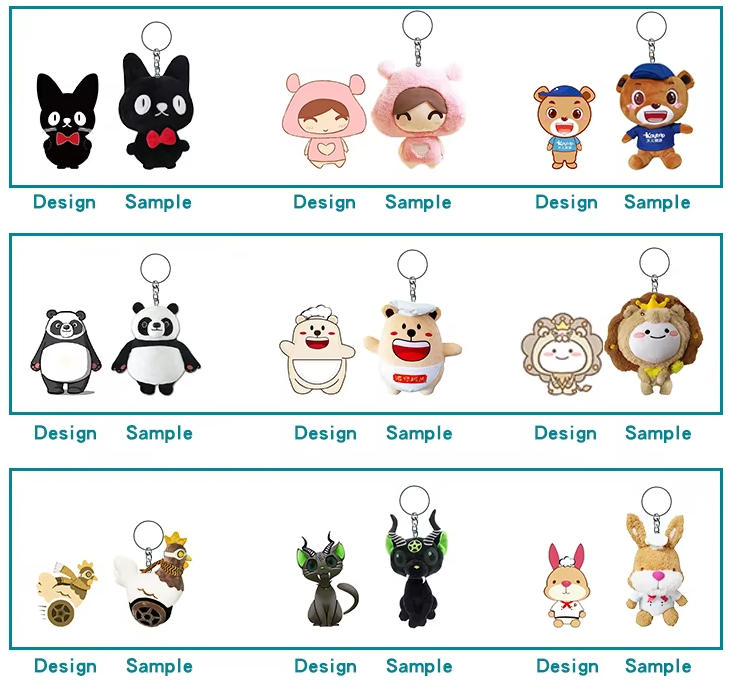 Clients may customize shapes, fabrics, embroidery, hardware, labels, and packaging based on branding needs. Keychain options include lobster clasps, split rings, carabiner clips, and nylon straps. Colors, accessories, and character expressions can be modified to suit retail themes.